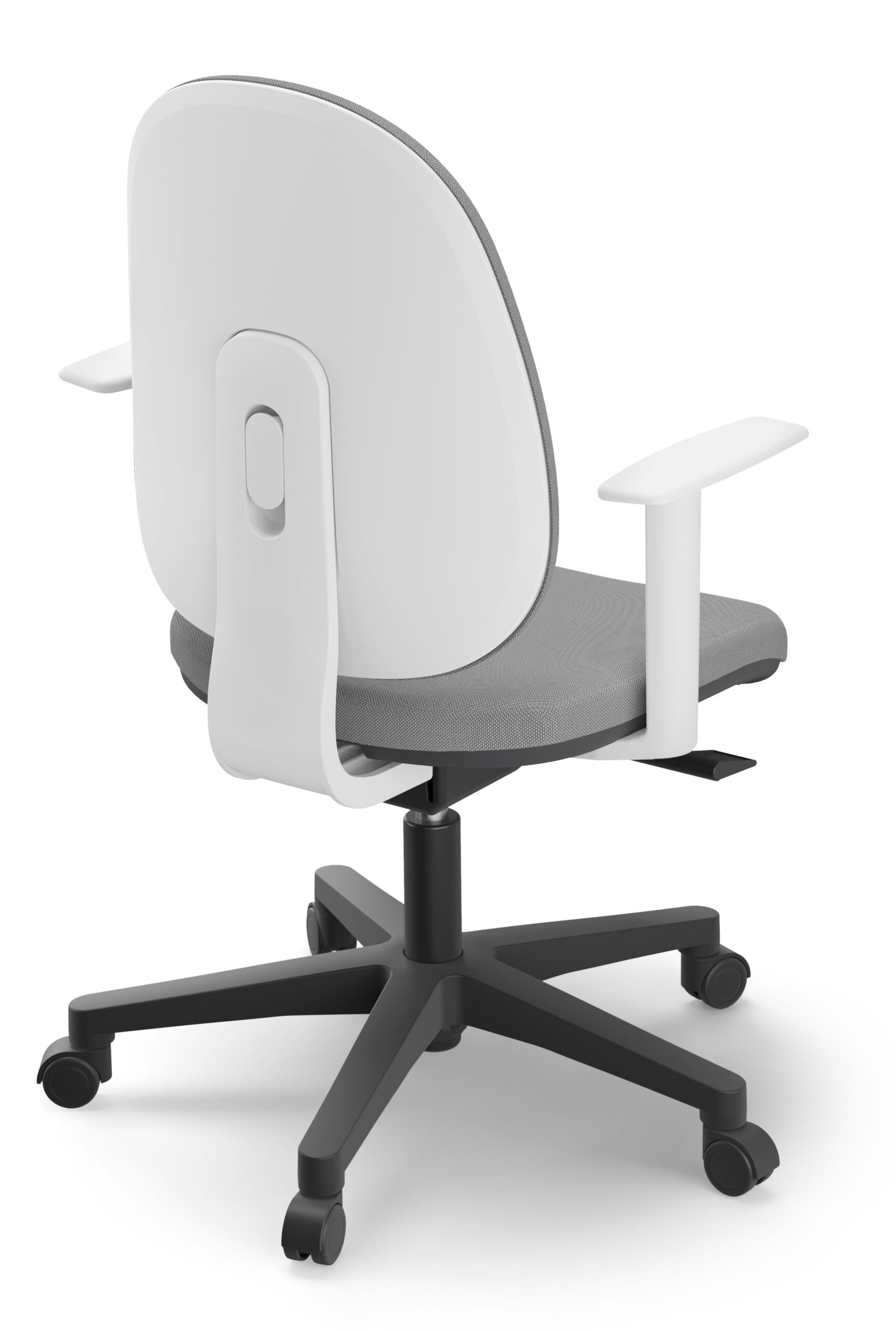 Silla de respaldo anatomico envolvente, de poliamida blanca, tapizado, respaldo fijo con apoyo lumbar regulable.